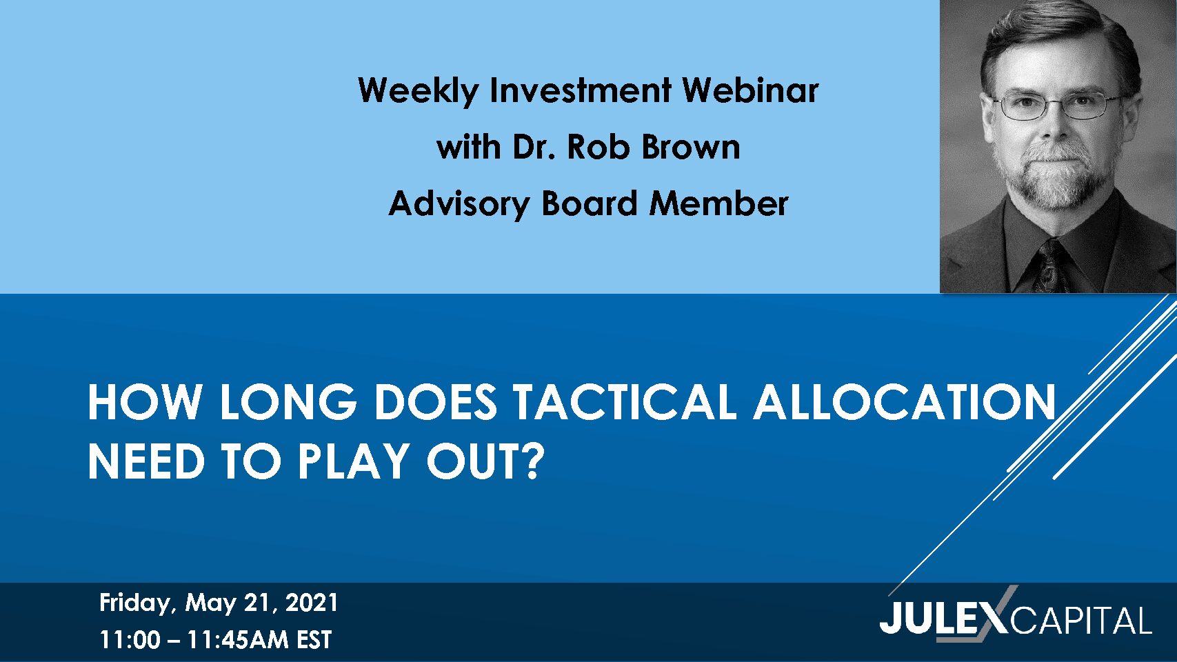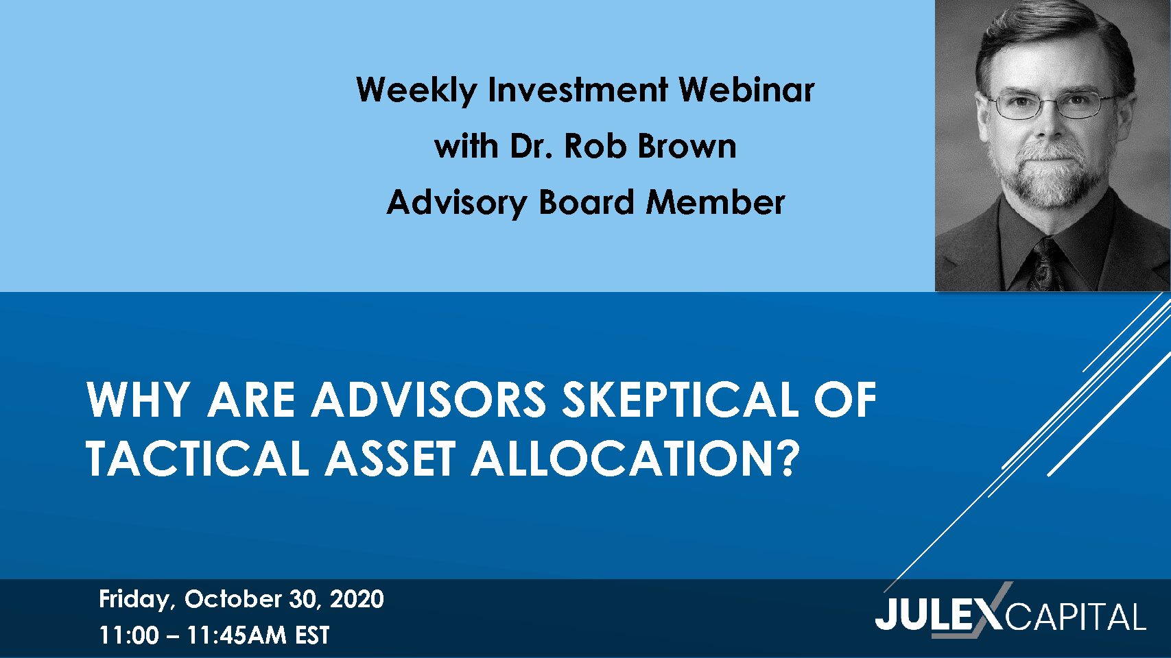This presentation is part 1 of our weekly webinar series with Investment Committee member Dr. Rob Brown. In this presentation, Rob discusses how today’s climate may be favorable to tactical allocation strategies, and answers participant questions regarding current events and the economy.